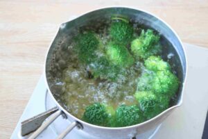 鍋に熱湯を沸かし、塩(分量外・少々)を入れ、ブロッコリーを入れて1〜2分茹でる。ざるに上げて湯を切る。