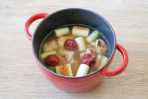 鍋に(1)、A【だし汁 350ml、みりん 大さじ2、薄口しょうゆ 小さじ1、塩 小さじ1/2】をいれて混ぜ、(3)、梅干しをのせる。